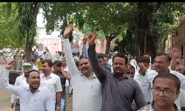 हापुड़ की घटना के दोषी अधिकारियों के स्थानांतरण को लेकर अधिवक्ताओं ने किया प्रदर्शन
