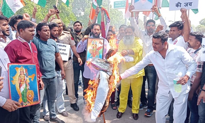 यमुनानगर । एंटी टेररिस्ट फ्रंट इंडिया के राष्ट्रीय अध्यक्ष वीरेश शांडिल्य के नेतृत्व में बड़ी संख्या में कार्यकर्ताओं ने बुधवार दोपहर को जगाधरी बस स्टैंड पर खालिस्तान समर्थक अमृतपाल सिंह का पुतला जलाया और जमकर नारेबाजी की।