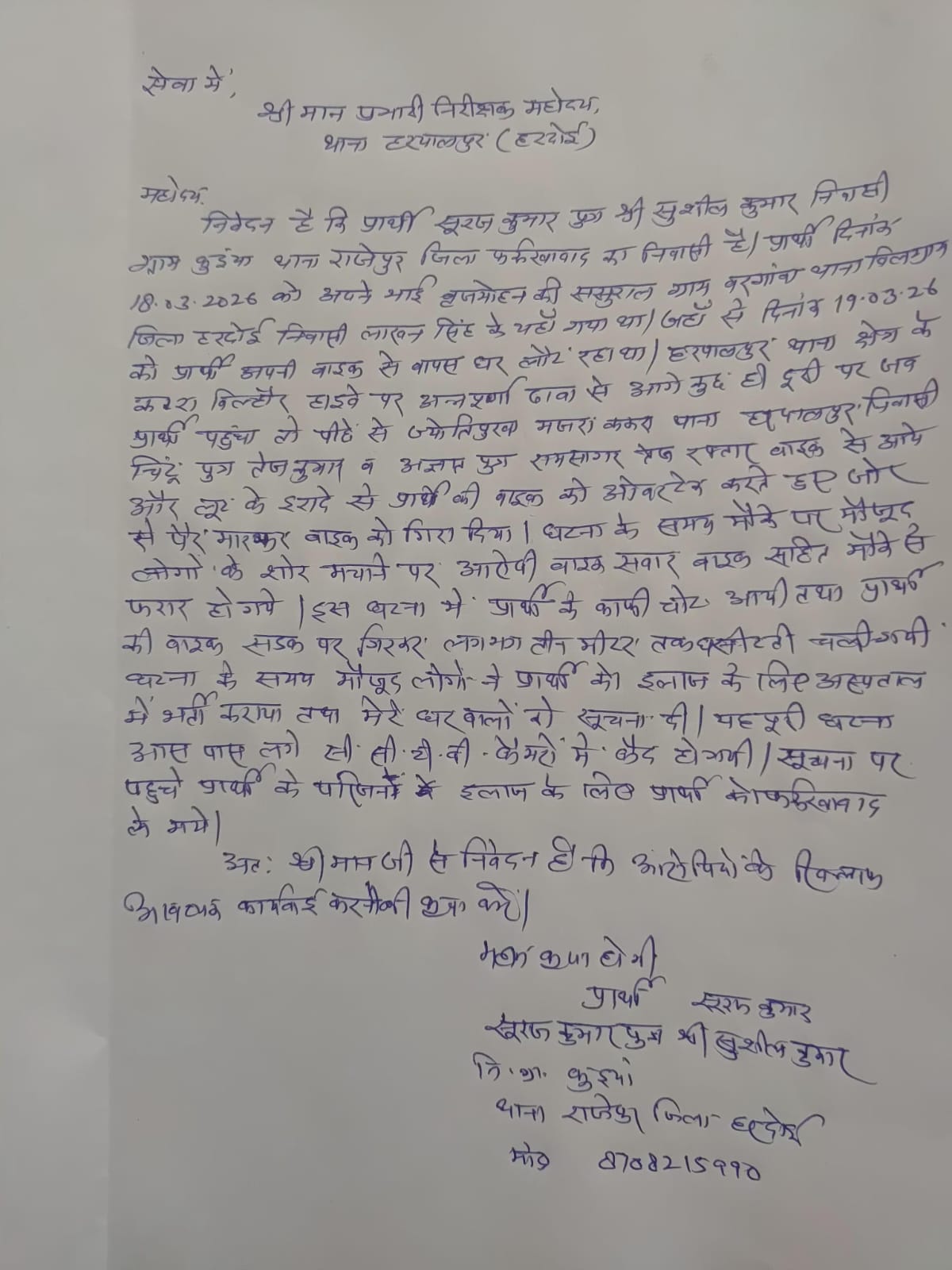जानकारी के अनुसार जनपद फर्रुखाबाद के थाना राजेपुर के गांव कुइयां निवासी सूरज कुमार पुत्र सुशील कुमार अपने भाई ब्रजमोहन की ससुराल थाना बिलग्राम के गांव बरगांवा जनपद हरदोई निवासी लाखन के घर गया था।जहां से वह बाइक पर वापस अपने घर लौट रहा था।जैसे ही वह हरपालपुर थाना क्षेत्र के कटरा विल्हौर हाइवे पर अन्नपूर्णा ढाबे से कुछ ही आगे पहुंचा उसी समय एक तेज रफ्तार हीरो स्ट्रीम बाइक पर सवार युवक ने पीछा करते हुए सूरज की बाइक को ओवरटेक कर पैर मारकर बाइक को गिरा दिया।इस घटना में सूरज सड़क पर गिरकर घायल हो गया और उसकी बाइक लगभग 3 मीटर तक रोड पर घसिटती हुई दूर जा गिरी।लोगो के शोर मचाने पर घटना के बाद आरोपी बाइक सवार मौके से फरार हो गया।घायल सूरज को इलाज के लिए निजी अस्पताल में भर्ती कराया गया तथा उसके परिजनों को फोन पर घटना की सूचना दी गयी।सूचना मिलते ही मौके पर पहुंचे परिजन घायल सूरज को इलाज के लिए फर्रुखाबाद ले गए।हालांकि बाइक सवार आरोपी की पहचान हरपालपुर थाना क्षेत्र के ज्योतपुरवा मजरा ककरा निवासी चिंटू पुत्र तेज कुमार के नाम से होने पर स्थानीय पुलिस को सूचना दी गयी।पूरी घटना आसपास लगे सीसीटीवी कैमरे में कैद हो गयी।यह कोई नई घटना नही है हाइवे पर आए दिन बाइक सवार महिलाओ के कुंडल नोचना व मोबाइल छीनने की कई घटनाओं को बाइक सवार युवक इसी तरह अंजाम देते रहते है।लेकिन इन पर कोई अंकुश नही लग रहा है।