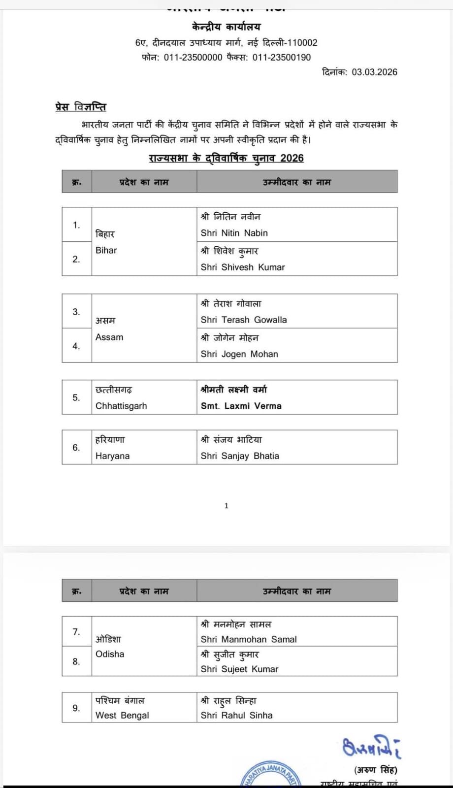 ओडिशा (उड़ीसा) से पार्टी ने मनमोहन सामल और सुजीत कुमार को उम्मीदवार बनाया है।भाजपा द्वारा जारी इस सूची को आगामी राज्यसभा चुनावों के मद्देनज़र महत्वपूर्ण माना जा रहा है। राजनीतिक जानकारों के अनुसार, विभिन्न राज्यों से संतुलित प्रतिनिधित्व देने की रणनीति के तहत इन नामों का चयन किया गया है। पार्टी नेतृत्व ने सभी उम्मीदवारों को शुभकामनाएं देते हुए उनके सफल कार्यकाल की उम्मीद जताई है।