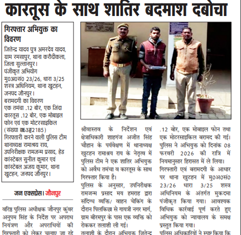 यह कार्रवाई अपर पुलिस अधीक्षक नगर आयुष श्रीवास्तव के निर्देशन एवं क्षेत्राधिकारी शाहगंज अजीत सिंह चौहान के पर्यवेक्षण में की गई। थानाध्यक्ष खुटहन रामाश्रय राय के नेतृत्व में गठित पुलिस टीम ने संदिग्ध व्यक्ति और वाहनों की चेकिंग के दौरान इस अभियुक्त को दबोचने में सफलता हासिल की।