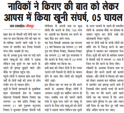 जन एक्सप्रेस/जौनपुर: जौनपुर शहर के गोमती नदी स्थित गोपी घाट पर बुधवार दोपहर नाविकों के बीच किराए को लेकर विवाद इतना बढ़ गया कि दोनों पक्षों में जमकर ईंट-पत्थर चलने लगे। इस खूनी संघर्ष में कुल पांच लोग घायल हो गए, जिससे घाट पर अफरा-तफरी का माहौल बन गया।