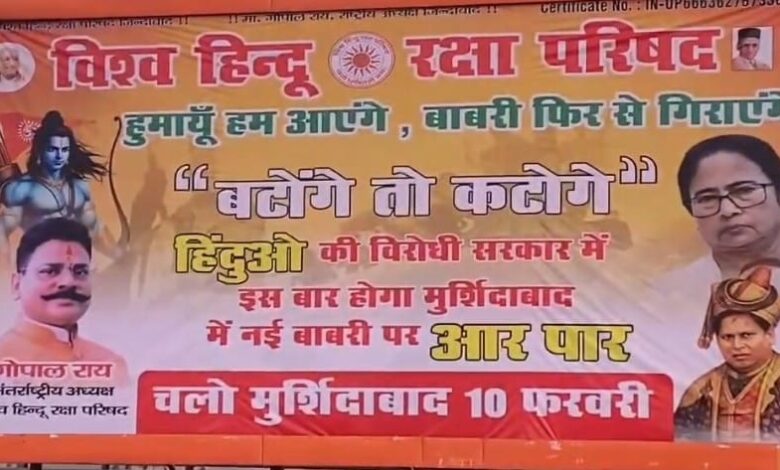 जन एक्सप्रेस/लखनऊ।राजधानी लखनऊ में विभिन्न चौराहों और सार्वजनिक स्थानों पर लगाए गए विवादित पोस्टर्स ने सियासी और साम्प्रदायिक माहौल को गरमा दिया है। इन पोस्टर्स के माध्यम से पश्चिम बंगाल के मुर्शिदाबाद में प्रस्तावित मस्जिद निर्माण का विरोध जताया गया है और 10 फरवरी को ‘मुर्शिदाबाद कूच’ का ऐलान किया गया है।बताया जा रहा है कि ये पोस्टर्स विश्व हिंदू…