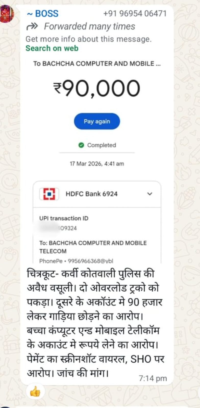 मामले ने उस वक्त तूल पकड़ा जब ऑनलाइन भुगतान का QR कोड और ट्रांजैक्शन का स्क्रीनशॉट सोशल मीडिया पर वायरल हो गया। इसके बाद विभाग में हड़कंप मच गया और आनन-फानन में कार्रवाई करते हुए प्रभारी को लाइन हाजिर कर दिया गया।हालांकि, इस पूरे प्रकरण में नाम सामने आने वाले कारखास कांस्टेबल नीशू द्विवेदी पर अब तक कोई ठोस कार्रवाई नहीं होने से सवाल खड़े हो रहे हैं। स्थानीय लोगों का आरोप है कि जांच एकतरफा की जा रही है और जिम्मेदारों को बचाने की कोशिश की जा रही है।जनता के बीच यह चर्चा तेज है कि क्या केवल एक अधिकारी पर कार्रवाई कर मामले को ठंडे बस्ते में डालने की कोशिश हो रही है, या फिर पूरे नेटवर्क की निष्पक्ष जांच कर सच्चाई सामने लाई जाएगी।यह मामला पुलिस की कार्यप्रणाली और पारदर्शिता पर गंभीर सवाल खड़े कर रहा है। अब निगाहें इस बात पर टिकी हैं कि क्या जांच एजेंसियां पूरे मामले की गहराई तक जाएंगी या फिर यह कार्रवाई महज औपचारिकता बनकर रह जाएगी।