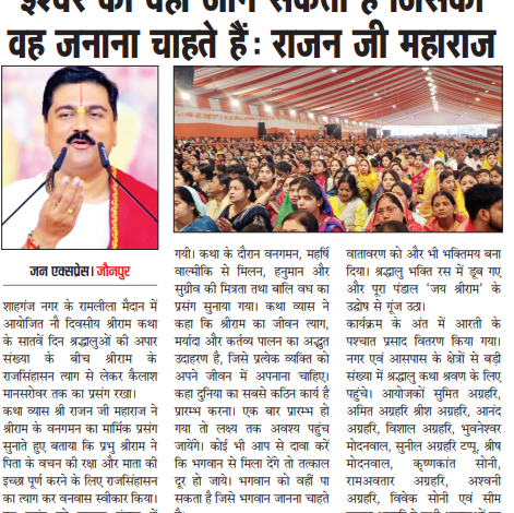जन एक्सप्रेस/जौनपुर: नगर के रामलीला मैदान में आयोजित नौ दिवसीय श्रीराम कथा के सातवें दिन श्रद्धालुओं की भारी भीड़ उमड़ पड़ी। कथा के दौरान भगवान श्रीराम के त्याग, मर्यादा और कर्तव्य पालन का भावपूर्ण वर्णन किया गया, जिससे पूरा पंडाल भक्ति रस में डूब गया।