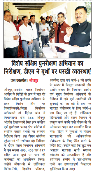 जन एक्सप्रेस/जौनपुर: भारत निर्वाचन आयोग के निर्देशानुसार चल रहे विशेष संक्षिप्त पुनरीक्षण अभियान के तहत विशेष तिथि पर जिलाधिकारी/जिला निर्वाचन अधिकारी डॉ. दिनेश चंद्र ने विधानसभा क्षेत्र 366 जौनपुर अंतर्गत तिलकधारी सिंह इंटर कॉलेज एवं मुक्तेश्वर प्रसाद इंटर कॉलेज में स्थापित मतदेय स्थलों का स्थलीय निरीक्षण किया। इस दौरान संबंधित एईआरओ भी उपस्थित रहे।