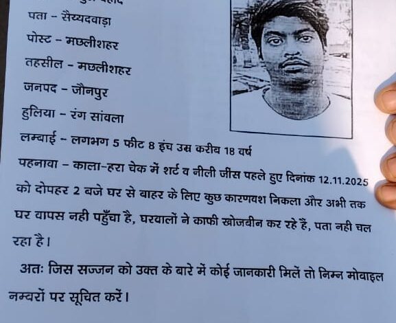 जन एक्सप्रेस/जौनपुर: जौनपुर सैय्यदवाड़ा, कस्बा मछलीशहर निवासी अब्दुल वाहिद के 18 वर्षीय पुत्र मो. कैफ चार दिन से लापता हैं। परिजनों के अनुसार मो. कैफ 12 नवम्बर 2025 को दोपहर 2:30 बजे घर से यह कहते हुए निकले थे कि “दस मिनट में लौट आएंगे”, लेकिन उसके बाद से वह घर नहीं लौटे।