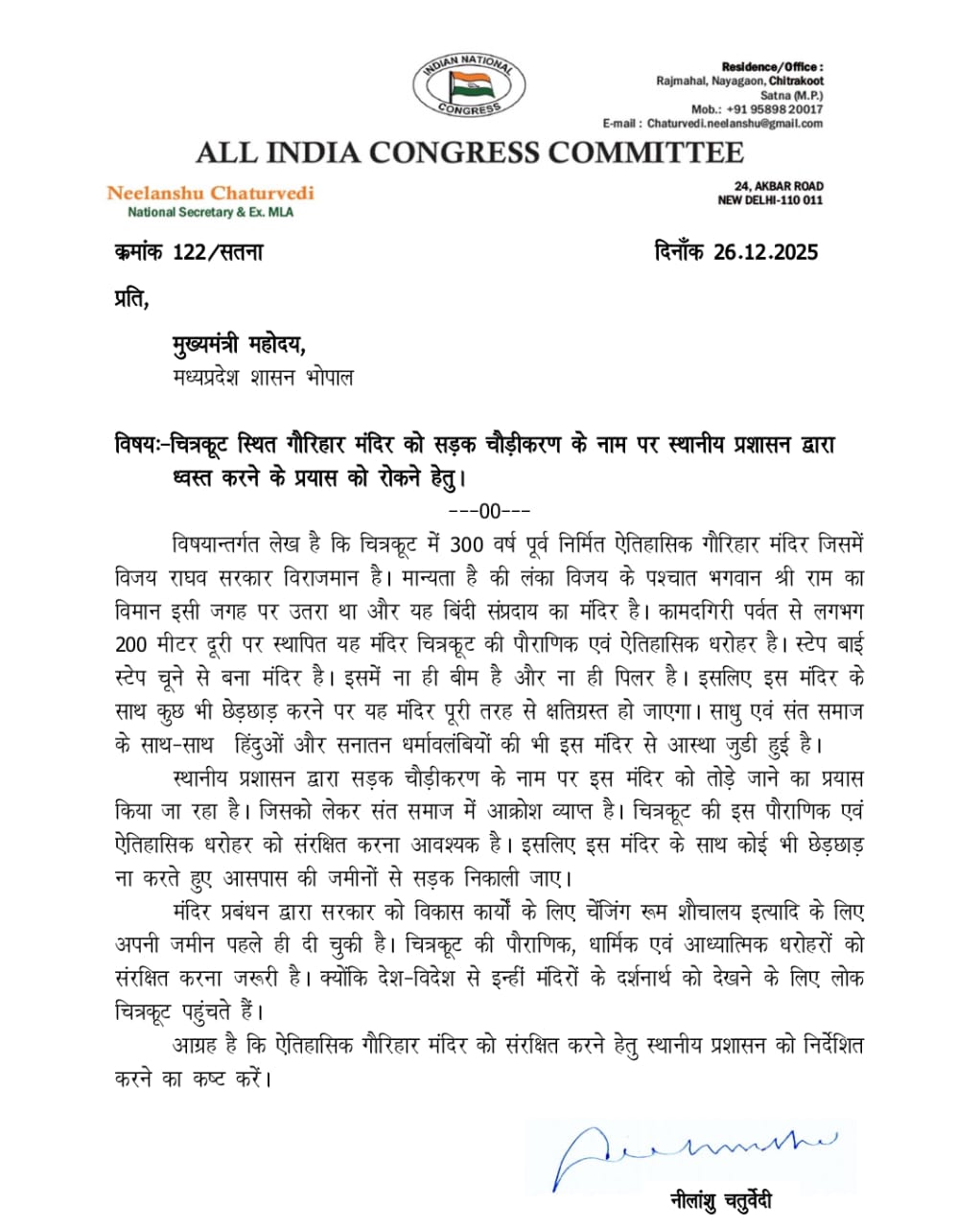 धार्मिक धरोहरों की सुरक्षा सुनिश्चित करेंसाधु-संतों और श्रद्धालुओं की भावनाओं का सम्मान करें और चित्रकूट की सनातन पहचान को अक्षुण्ण बनाए रखें (नीलांशु चतुर्वेदी — पूर्व विधायक, राष्ट्रीय सचिव, कांग्रेस पार्टी)