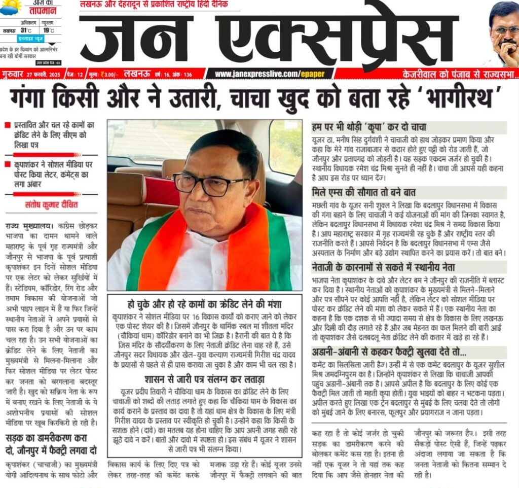 जन एक्सप्रेस/ राज्य मुख्यालय: कांग्रेस छोड़कर भाजपा का दामन थामने वाले महाराष्ट्र के पूर्व गृह राज्यमंत्री और जौनपुर से भाजपा के पूर्व प्रत्याशी कृपाशंकर इन दिनों सोशल मीडिया पर एक लेटर को लेकर सुर्खियों में हैं। स्टेडियम, कॉरिडोर, रिंग रोड और तमाम विकास की योजनाओं जो अभी पाइप लाइन में हैं या फिर जिन्हें स्थानीय नेताओं ने अपने प्रयासों से पास करा दिया है और उन पर काम चल रहा है। उन सभी योजनाओं का क्रेडिट लेने के लिए नेताजी का मुख्यमंत्री से मिलना-मिलाना और फिर सोशल मीडिया पर लेटर पोस्ट कर जनता को बरगलाना बदस्तूर जारी है। खुद को सक्रिय नेता के रूप में बनाए रखने के लिए नेताजी के ये अशोभनीय प्रयासों की सोशल मीडिया पर खूब किरकिरी हो रही है।