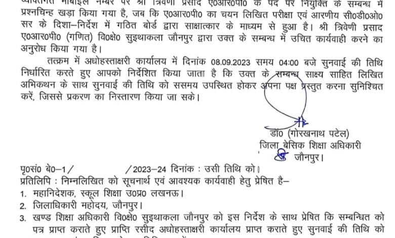 जिला बेसिक शिक्षा अधिकारी डाoगोरखनाथ पटेल ने उक्त मामले को गम्भीरता से लिया और सवाल उठाने वाले रंणजय सिंह प्रधानाध्यापक प्राथमिक विद्यालय मायरी सुईथाकला ,व हरसू प्रसाद मिश्रा प्रधानाध्यापक खेतापुर सुईथाकला को पत्र जारी कर दिनांक 8-09-2024 दिन शुक्रवार को साक्ष्य सहित लिखित अभीकथन के साथ स्वंग प्रस्तुत होने का निर्देश जारी किया।