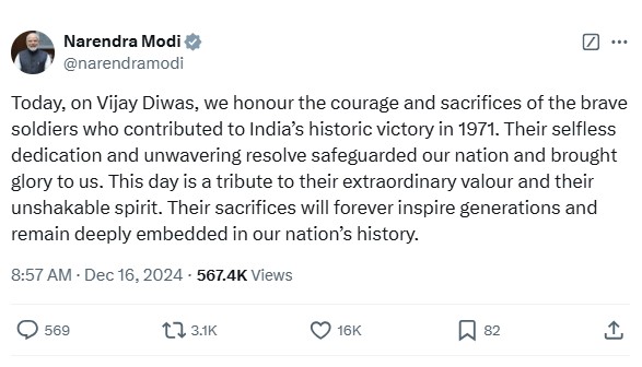 उन्होंने ‘एक्स’ पर लिखा, “आज विजय दिवस पर, हम 1971 की ऐतिहासिक जीत में योगदान देने वाले वीर सैनिकों की बहादुरी और बलिदान को सम्मानित करते हैं। उनकी निस्वार्थ समर्पण और अटूट संकल्प ने हमारे देश को गौरव दिलाया। यह दिन उनके असाधारण शौर्य और अडिग जज्बे को समर्पित है। उनका बलिदान आने वाली पीढ़ियों को हमेशा प्रेरित करता रहेगा।”
