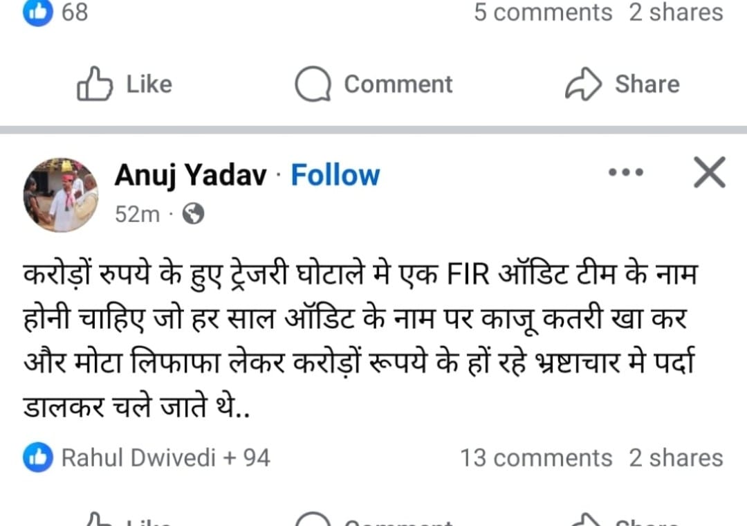 अनुज यादव ने कहा कि हर साल ऑडिट टीम ग्राम पंचायतों में पहुंचती है और ‘ऑडिट’ के नाम पर मोटे लिफाफे लेकर फाइलें क्लियर कर देती है। करोड़ों रुपये के ट्रेजरी घोटाले में यदि किसी पर पहली एफआईआर होनी चाहिए, तो वह ऑडिट टीम पर होनी चाहिए।उन्होंने तंज कसते हुए कहा, ये वही लोग हैं जो हर साल आते हैं, काजू कतरी खाते हैं, नोटों के लिफाफे उठाते हैं और फिर भ्रष्टाचार की फाइलों पर पर्दा डालकर चले जाते हैं!”