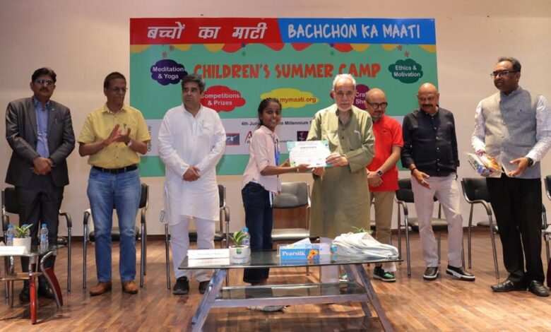 नोएडा/नई दिल्ली। माटी की ओर से द मिलिनीयम स्कूल, नोएडा में “बच्चों का माटी” समर कैंप सफलतापूर्वक संपन्न हुआ। दिनभर चले शिविर एवं समापन समारोह में दिल्ली एवं एनसीआर के 100 से अधिक सरकारी एवं निजी स्कूलों के छह सौ बच्चों तथा उनके माता-पिता ने भाग लिया। समापन समारोह की अध्यक्षता माटी न्यास के अध्यक्ष एवं वरिष्ठ पत्रकार राम बहादुर राय ने की। उत्तर प्रदेश विधान परिषद सदस्य साकेत मिश्रा तथा दिल्ली विधायक दिलीप पांडे मुख्य अतिथि के रूप में उपस्थित रहे, जबकि विशिष्ट अतिथि एनडीएमसी क्षेत्र इलेक्ट्रिसिटी शिकायत निवारण फ़ोरम के अध्यक्ष शलभ कुमार श्रीवास्तव तथा वरिष्ठ वैज्ञानिक प्रोफ़ेसर नागेंद्र सिंह रहे।
