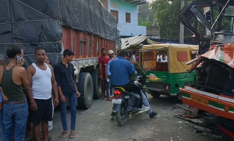 रोडवेज बस को टक्कर मार ट्रक दुकान में घुसा, यात्री और दुकानदार सुरक्षित,बस चालक घायल