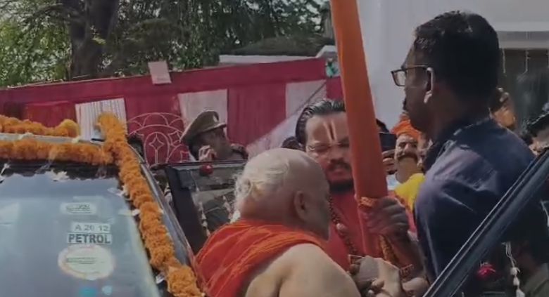अखिलेश यादव पर सवाल सुनते ही रामभद्राचार्य ने बंद किया गाड़ी का शीशा