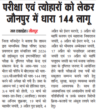 परीक्षा एवं त्योहारों को लेकर जौनपुर में धारा 144 लागू