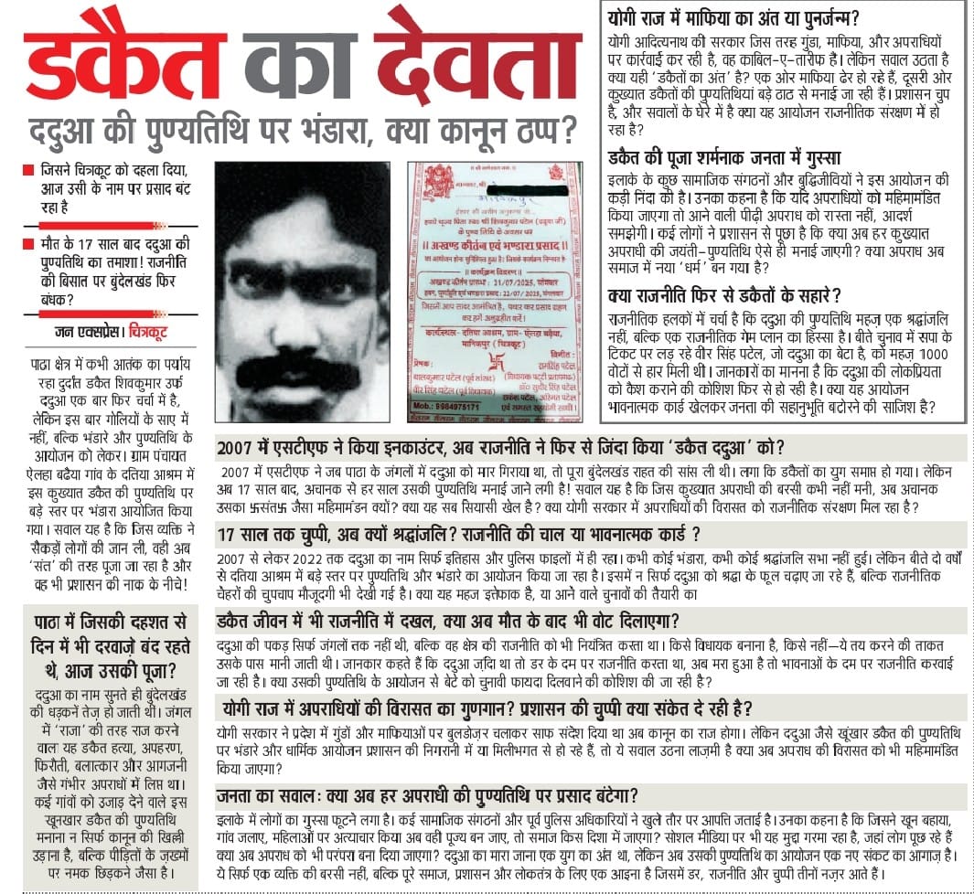 कितने निर्दोषों को ददुआ ने केवल इसलिए मारा क्योंकि उन्होंने वोट नहीं दिया, विरोध किया या उसके रास्ते में आए। उनका क्या? क्या अब लोकतंत्र में गोलियों से डराने वाला महान और वोट मांगने वाला मजाक बन जाएगा?
