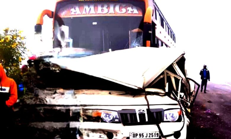 बुन्देलखण्ड एक्स्प्रेस वे पर डबल डेकर स्लीपर टुरिस्ट बस ने बुलेरो को मारी टक्कर,चार की मौत