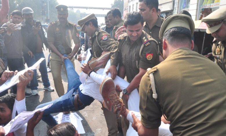 हजरतगंज में छात्र संगठनों का दोहरा विरोध, न्यायपालिका पर दबाव और अहिल्याबाई होल्कर प्रतिमा खंडन पर उठाई आवाज