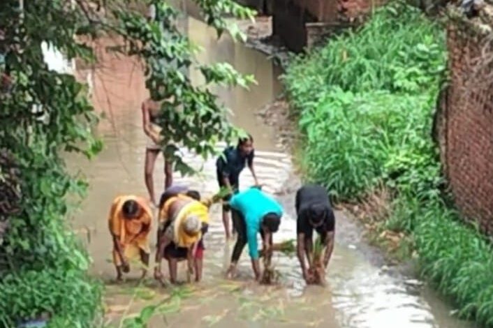 भुवालापट्टी के लोगों ने सड़क पर की धान की रोपाई, फाटो हुआ वायरल।