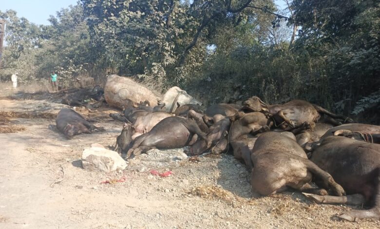 चित्रकूट के बगदरा घाटी में पलटा जानवरों से लोड ट्रक,दो दर्जन भैंसों की मौत