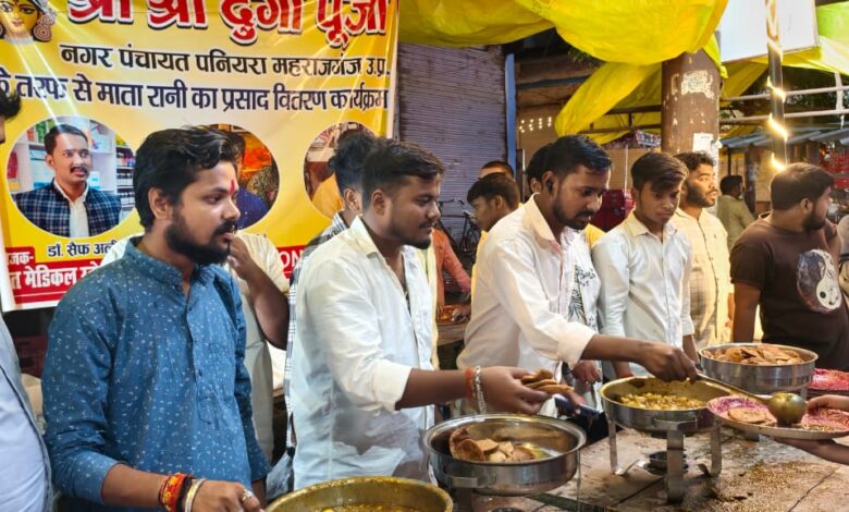 जन एक्सप्रेस/पनियरा: महराजगंज हिन्दू धर्म का पवित्र त्यौहार नवरात्रि के बाद विजयादशमी के दिन नगर पंचायत पनियरा में गंगा-जमुनी तहजीब की अनोखी मिसाल देखने को मिली। यहां दो हिंदू और एक मुस्लिम युवक ने मिलकर दुर्गा मंदिर चौराहे पर भव्य भंडारे का आयोजन किया। माता रानी के नाम पर हुए इस प्रसाद वितरण में श्रद्धालुओं की भारी भीड़ उमड़ी और सभी ने इस पहल की सराहना की।